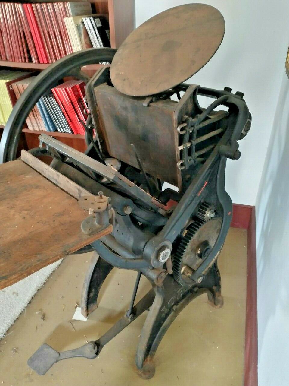 My latest restoration is this Golding Official no. 4 with a 6 x 9 chase. This size is really the sweet spot for tabletop presses. Not too big, and not too small. It can produce really fine work. This press is a late model from the early 1900’s and it is an excellent example with no repairs or welds. It has all it’s original parts right down to the screws and wood board it is mounted on. New rollers and trucks. Included with all presses I sell is a printing lesson on the press you are buying and my Falstrom adjustment gauge that allows both impression and roller height setting with ease. I have restored over 100 presses. You can be assured a fully adjusted press that prints beautifully. Pickup at my shop in Lyme, CT. Sold and going to live in MA. john.falstrom@att.net
