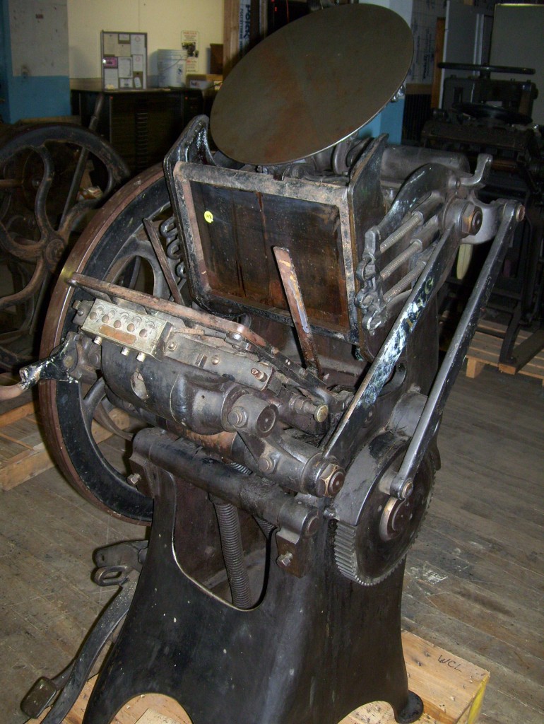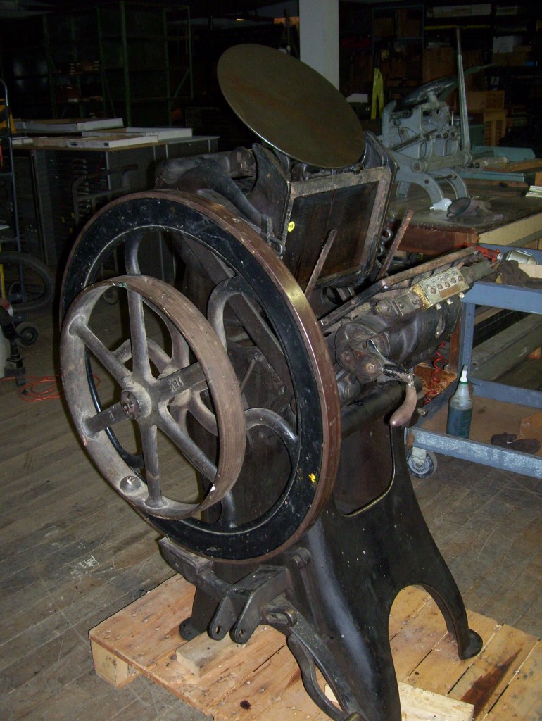 I recently purchased this press and four type cabinets full of type from a nice elderly woman in Waterbury, CT. The press was in her basement and used by her brother to earn extra income. I believe the brother had passed away some time ago and hadn’t used any of the equipment since the early 80’s. A recent episode of American Pickers where a press like this was found prompted the owner to decide to sell it. It is about as dirty a press as I have ever come across, but, under all that dirt is a really good press. It originally was owned by the Waterbury Buckle Co. The press is missing the drawers which is often the case, but, a cabinet maker would not have a problem recreating them. It came with one regular original chase, a spider chase and three sets of rollers. A spider chase is in the press and creates a smaller centered chase to work in if what your are printing is not large. The really nice surprise,( and I say surprise because it was so dark in her basement,) is that there are no broken parts, repairs or welds that I can find. I think that’s unusual because parts are pretty fragile on this press and are often broken. The date on it is 1890.